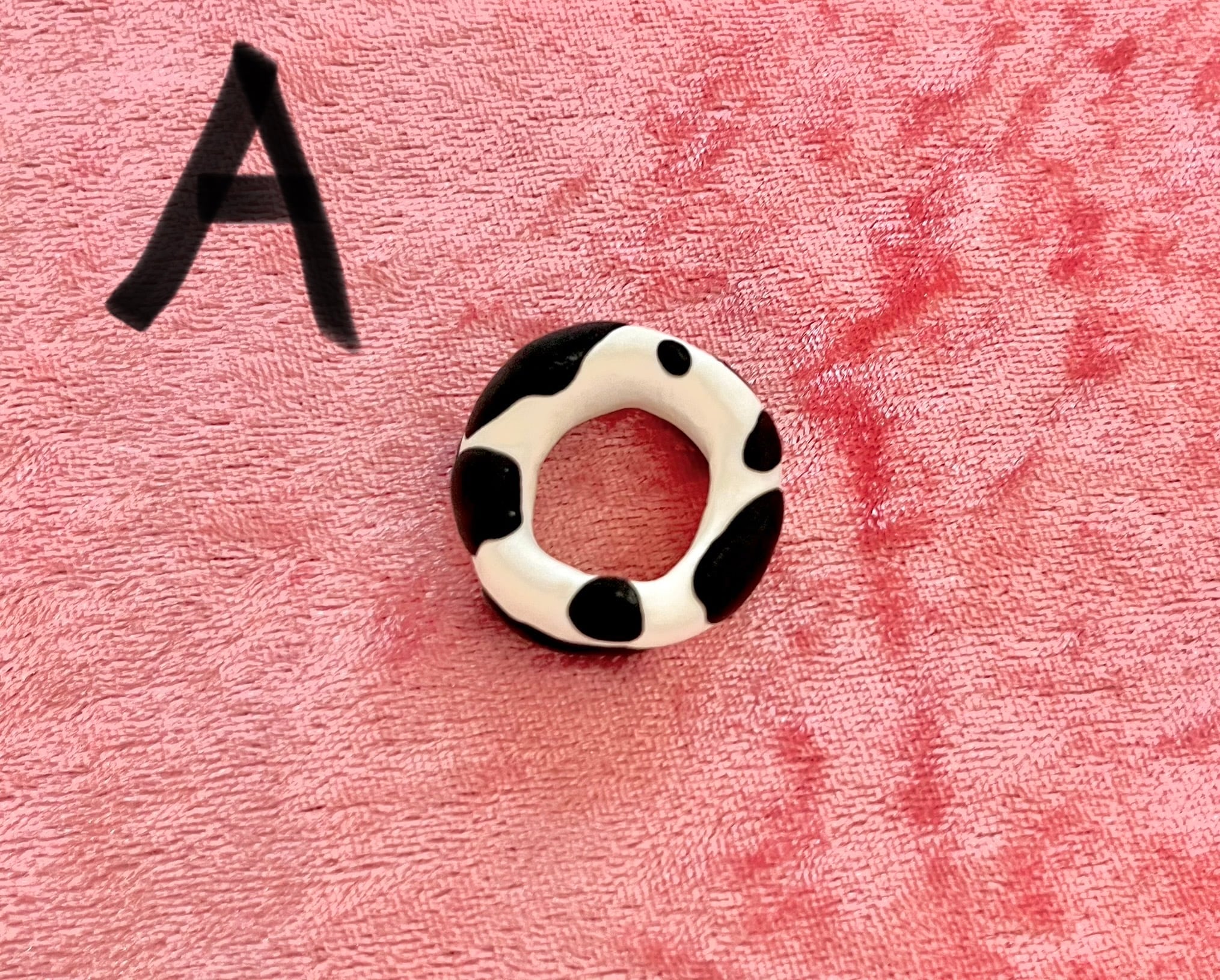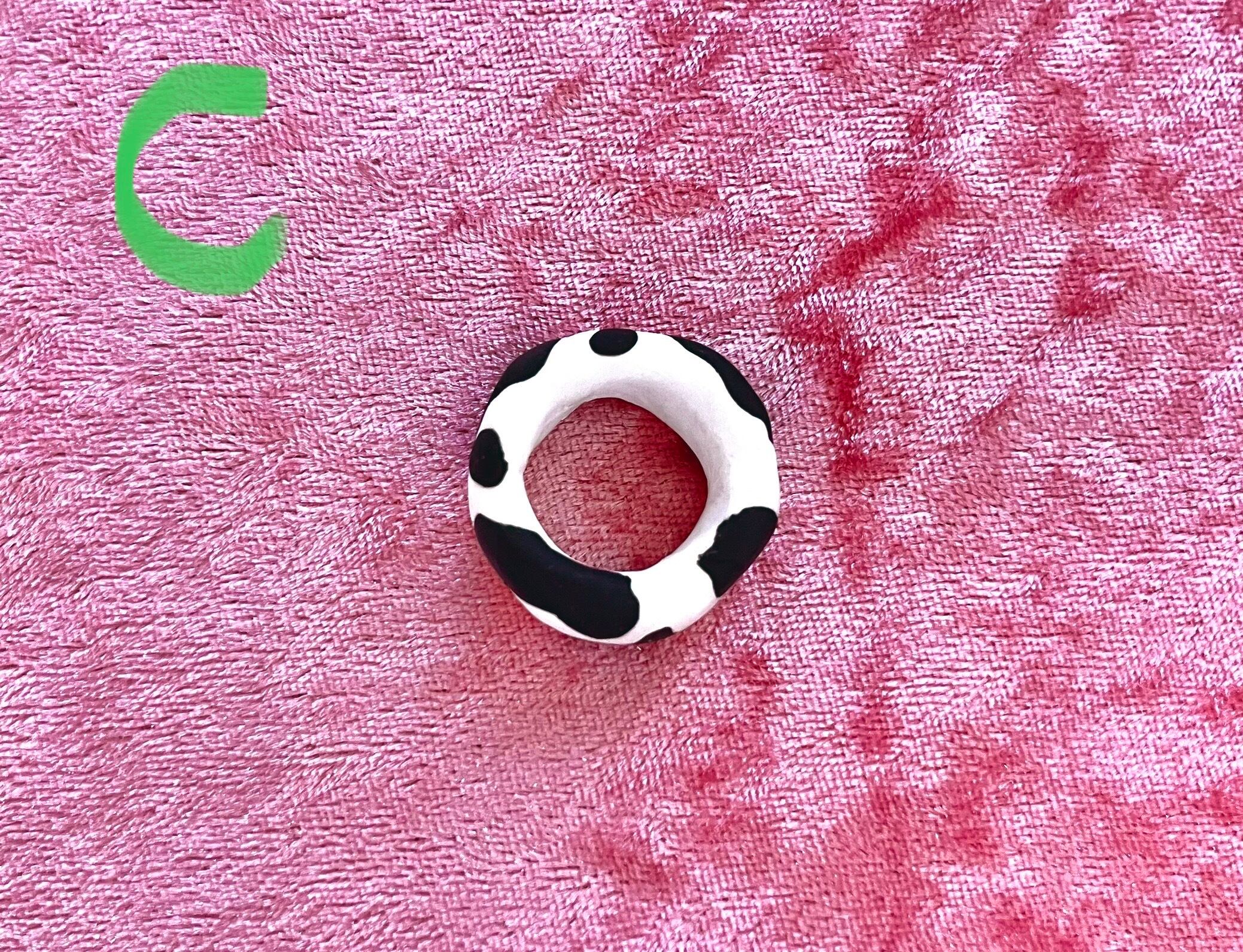 牛柄のクレイリングです。 3種あり、全てのサイズが11~12号ほどです。